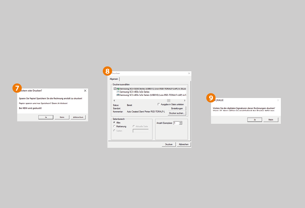 - Anschließend werden Sie gefragt, ob Sie die Signaturen zu dieser Rechnung drucken möchten. Klicken Sie hier, wenn diese benötigt werden, auf "JA" und wählen Sie anschließend den Drucker dafür aus und bestätigen Sie mit "Drucken".