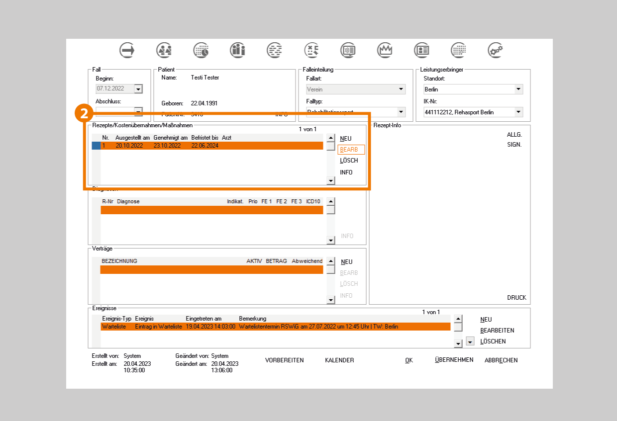 - Anschließend öffnen Sie die Maßnahmenoberfläche ("Rezepte/Kostenübernahmen/Maßnahmen") mit "BEARB".