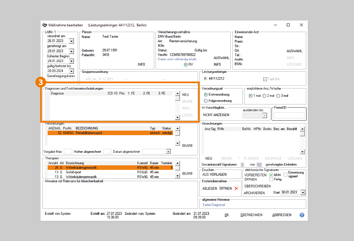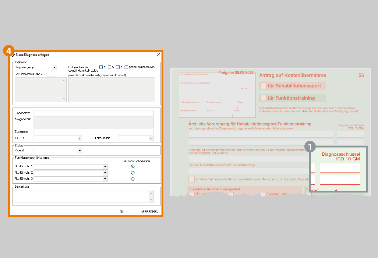 - erfassen Sie den ICD 10 Code der Diagnose vom Antrag auf Kostenübernahme (Muster 56) (1). Im Eingabetext kann die Diagnose zusätzlich als Klartext erfasst werden.