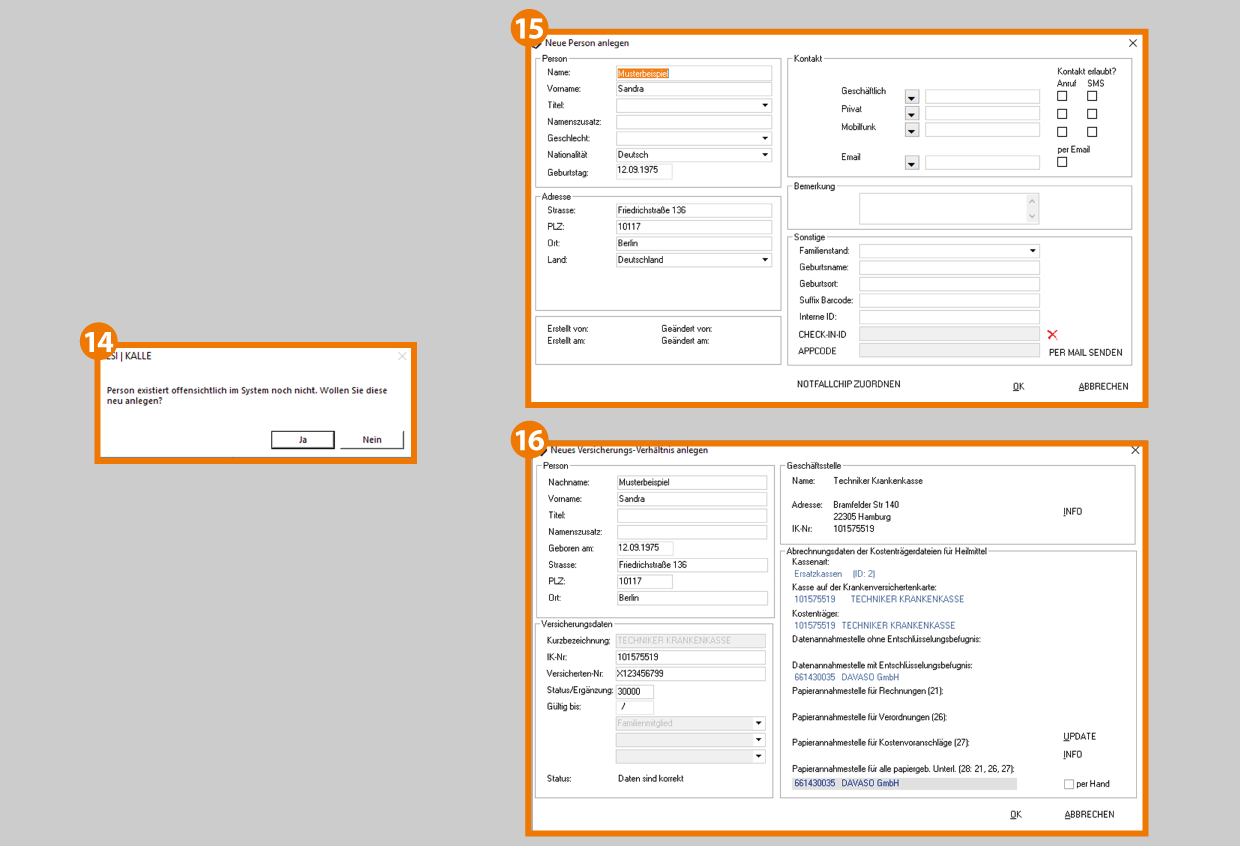 - Gibt es keine Person mit diesem Namen in KALLE, geht der Assistent anschließend die Neuanlage der Personendaten und des Versicherungsverhältnisses durch.