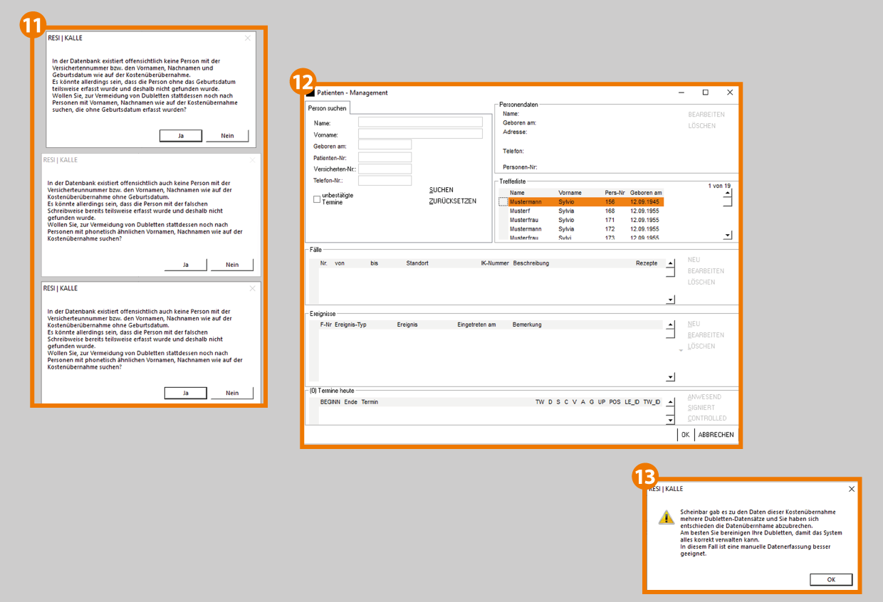 - Anderen Falls prüft der Assistent, ob diese Person mit Name, Vorname und Geburtsdatum bereits hinterlegt ist. Ist dies der Fall geht es mit Punkt 17 weiter. Anderen Falls prüft der Assistent, ob es eine Person mit ähnlich klingenden Namen (zum Beispiel bei Schreibfehlern) gibt und bietet eine Auswahl an.