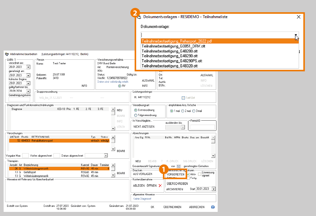 - In der folgenden Auswahl wählen Sie die Teilnahmeliste entsprechend der Vorgabe des Versicherungsträgers aus und speichern mit "OK". Daraufhin wird die Signaturliste erstellt und automatisch ein Häkchen bei "Aktiv" gesetzt. Hierbei dürfen Sie das Häkchen nicht selbstständig setzen.
