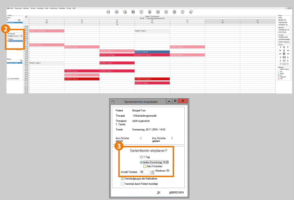 - Daraufhin öffnet sich der "KALENDER" aus Personensicht. Im Bereich "Therapie" setzen Sie den Haken bei der entsprechenden Behandlungs-Serie und es erscheinen die Gruppen gleichen Termintyps im Kalender. Per Drag'n'Drop ausgehend unterhalb der angehakten "Therapie" können Sie die Person in eine Gruppe ziehen, indem Sie die linke Maustaste gedrückt halten und auf den Gruppentermin schieben. Lassen Sie nun die Maustaste los. Jetzt öffnet sich ein Dialogfenster "Serientermin einplanen", in dem Sie auswählen können zwischen der einmaligen Einplanung "1 Tag" oder mehreren Folgeterminen. Bitte beachten Sie "Anz./Woche erlaubt" in Bezug auf "Anz./Woche geplant", um Überschreitungen zu vermeiden.