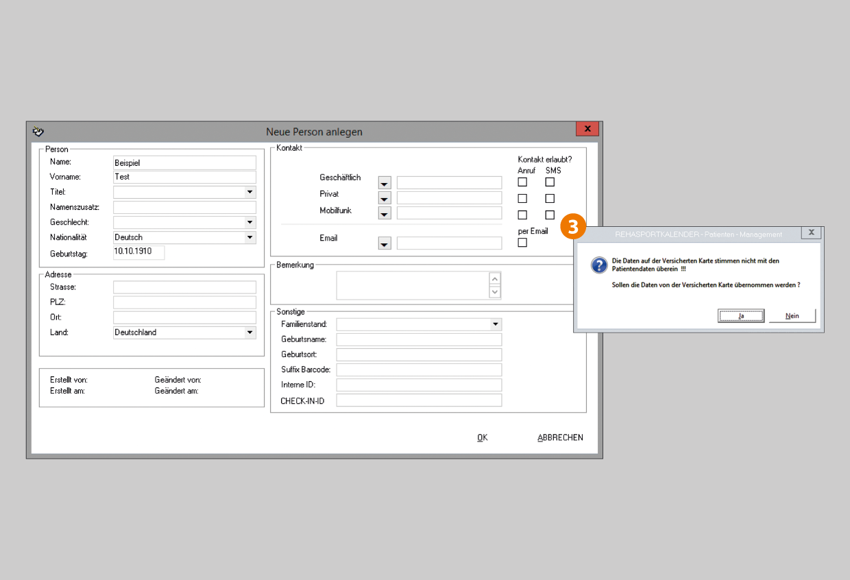 - Wenn sich an den Personendaten etwas geändert hat, wird gefragt, ob man die Änderungen übernehmen möchte. Wenn dem zugestimmt wird, öffnet sich das Fenster zur weiteren Bearbeitung der Personendaten. Die Daten von der Gesundheitskarte übernommen.