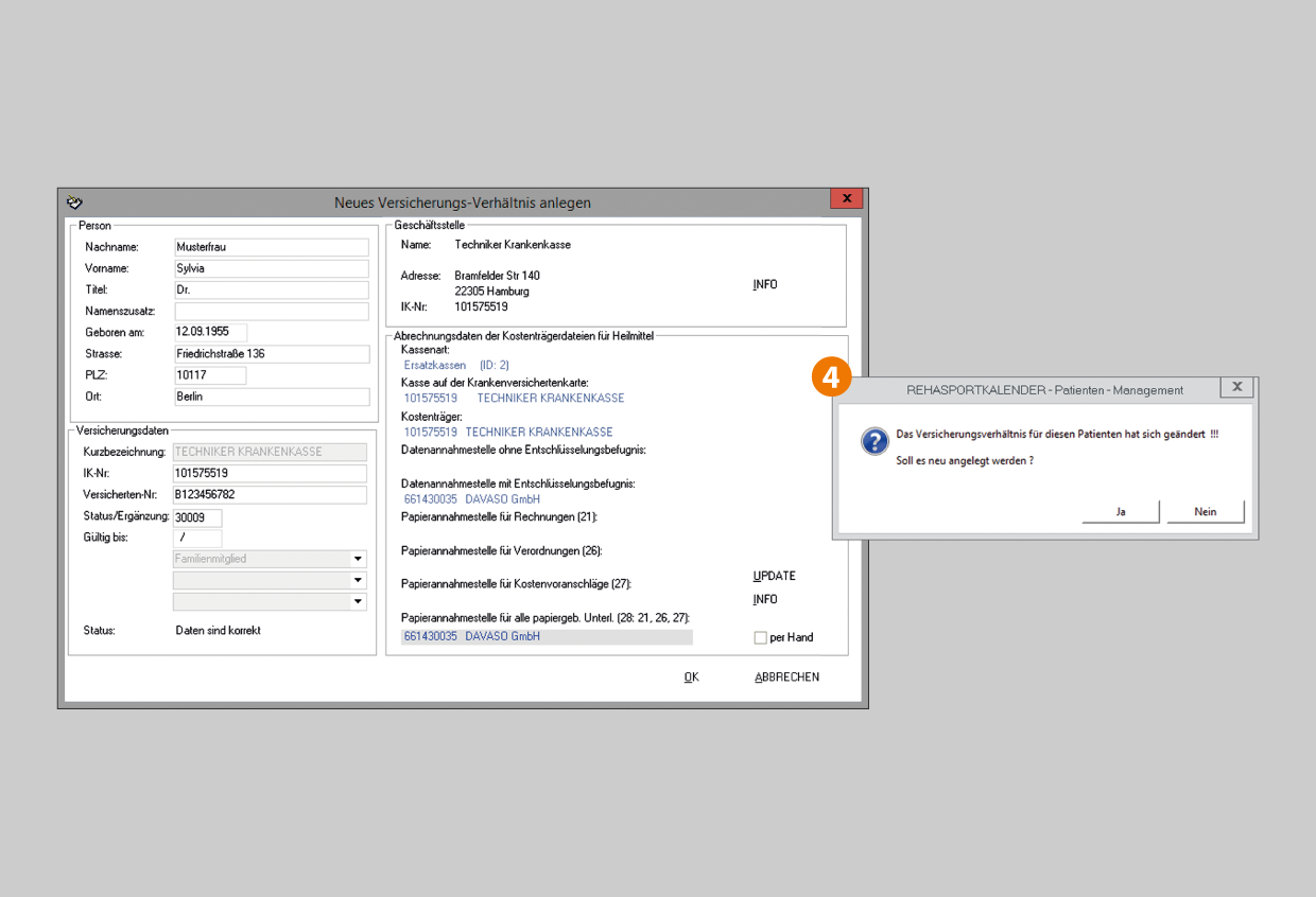 - Wenn sich an den Versichertendaten etwas geändert hat, wird gefragt, ob man die Änderungen übernehmen möchte. Wenn dem zugestimmt wird, öffnet sich das Fenster zur weiteren Bearbeitung der Versichertendaten. Die Daten von der Gesundheitskarte wurden übernommen und werden entsprechend angezeigt.