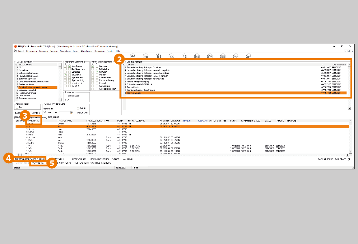 Sonderfall: Für Privatpatienten, DRV und BG schreiben Sie die Rechnungen, wenn Sie diese neu anlegen. Hier gehen Sie direkt auf das Feld "Rechn. nur drucken" und die Rechnung wird ausgegeben. - Zum elektronischen Versenden der Daten an die GKV klicken Sie das Feld "E-VERSAND" und alle noch nicht versendeten "Auftragsdateien" werden in der oberen Tabelle angezeigt.