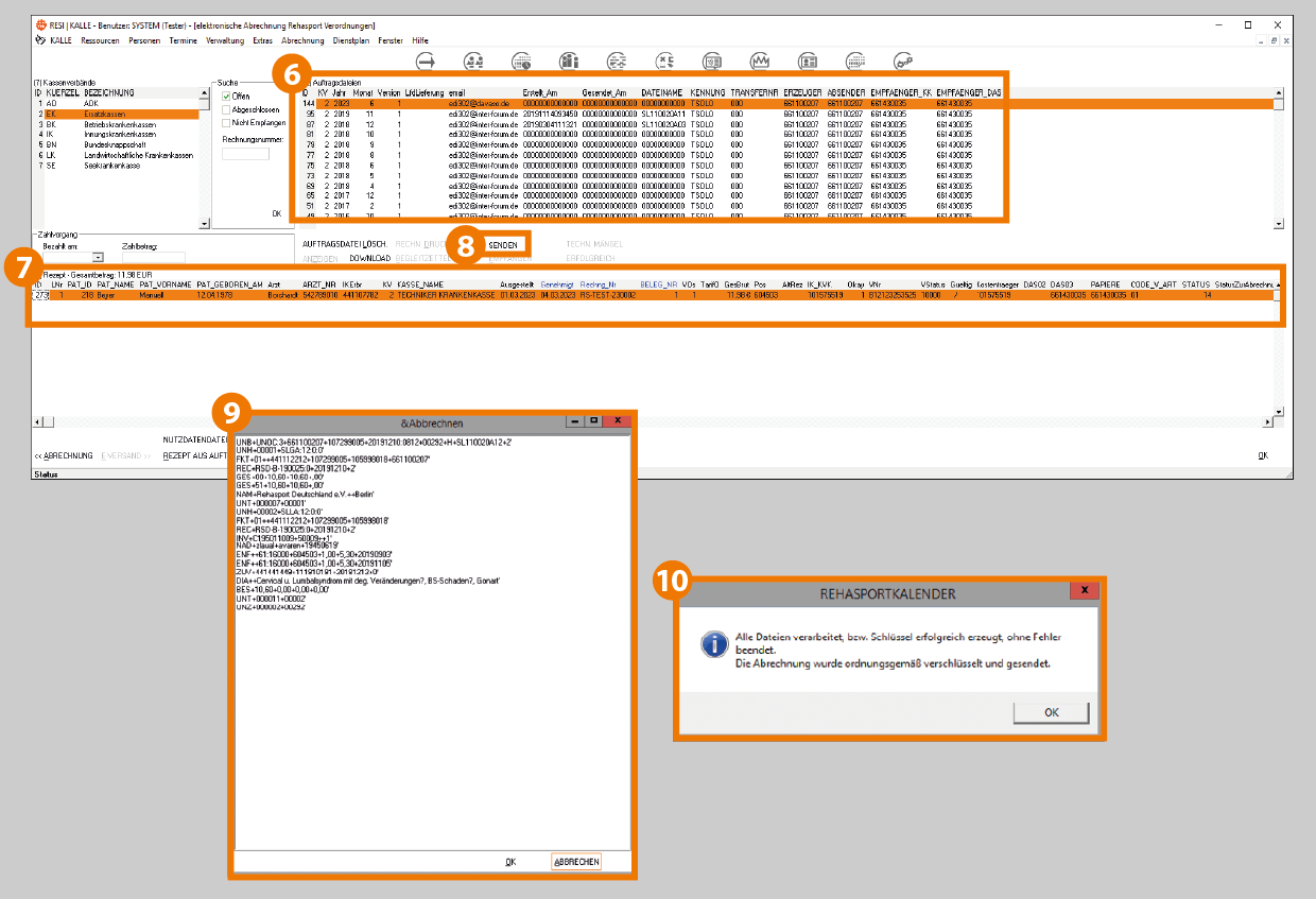- Dann alle Datensätze markieren und auf den Button "ELEKTRONISCHE ABRECHNUNG" gehen. Das darauf folgende Dialogfenster "Rezept zur Auftragsdatei" hinzufügen mit "Ja" bestätigen. Sollte es noch keine aktuelle Auftragsdatei geben bietet KALLE an eine zu erstellen. Dies bestätigen Sie mit "Ja". Es wurden nun Rechnungs- und Belegnummern vergeben und gespeichert. Sollten Verordnungen stehen geblieben sein, ist ein Fehler aufgetreten. Der Fehler wird angezeigt und muss in der Verordnung korrigiert werden.