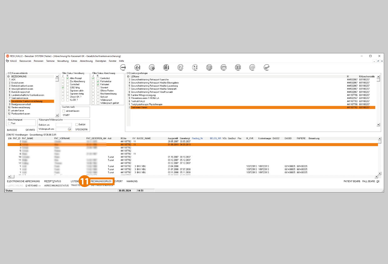 - Wählen Sie im Bereich "Leistungserbringer" den aus, für den die Abrechnung erfolgen soll. Die Liste aller freigegeben Verordnungen dieses Leistungserbringers erscheinen ("RS Verordnungen"). Anschließend werden alle freigegebenen (controlled gesetzten) Verordnungen im Bereich "RS Verordnungen" aufgelistet.
