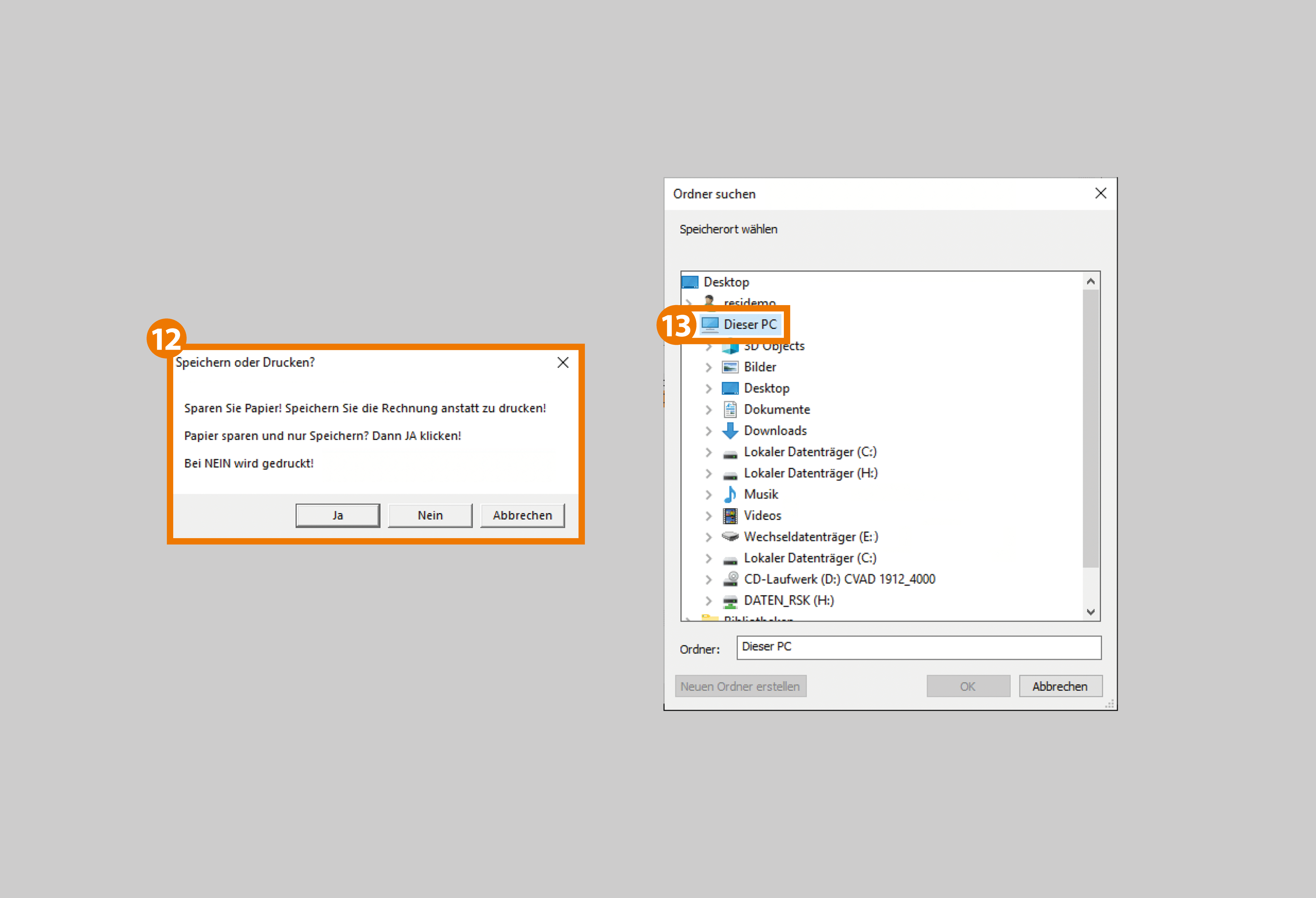 - Achten Sie beim Speichern darauf, dass Sie die Rechnungskopie in einem Ordner auf Ihrem lokalen Rechner speichern. Diese sind zu finden unter "Dieser PC" als "lokaler Datenträger" (z.B. "C:..." auf NAME IHRES PCs).