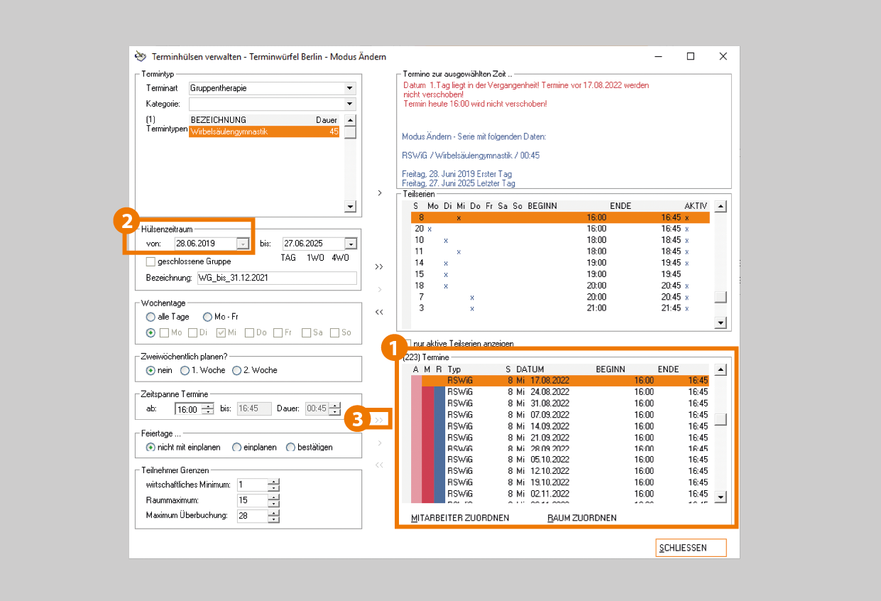 Mit dem Pfeil zum Einfügen „>>" im Einzelterminbereich unten fügen Sie den Termin ein.