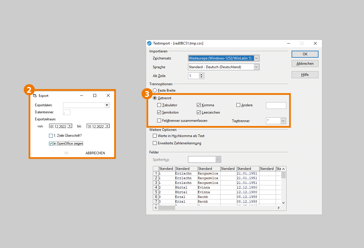 - Bei Aktivierung der Option "in OpenOffice zeigen" startet OpenOffice mit dem Importassistent. Hier können verschiedene Importoptionen gewählt werden. Bei einem Standardimport ist lediglich die richtige Wahl des Trennzeichens wichtig. Unser Standard ist hier ein Komma. Im Vorschaufenster im Bereich "Felder" wird das Ergebnis des Imports angezeigt. Ist alles voreingestellt, starten Sie den Import mit "OK".