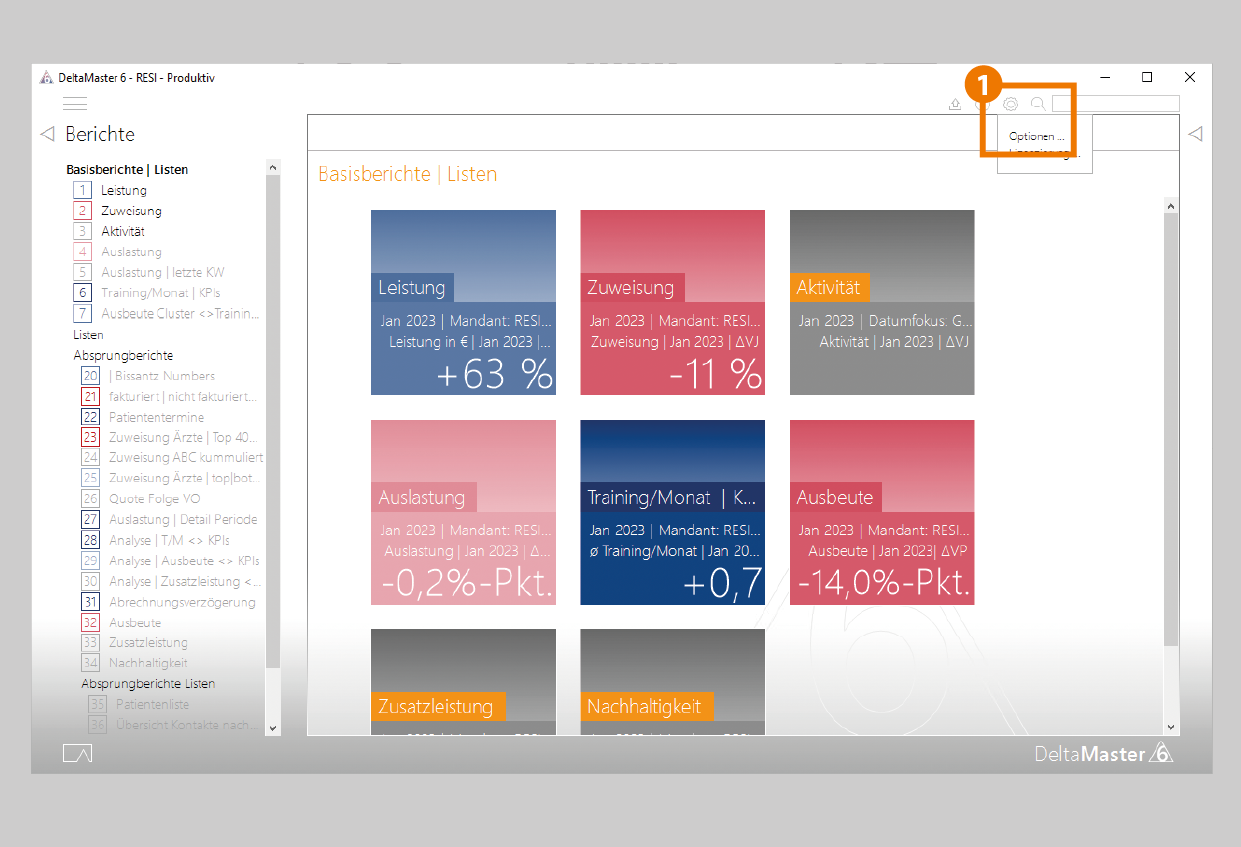- Öffnen Sie den Bericht, der exportiert werden soll, bewegen Sie ihre Maus an den oberen rechten Rand des Fensters und klicken über das erscheinende Zahnradsymbol auf "Optionen" um die Einstellungen zu öffnen.